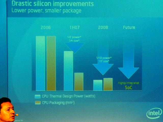 Yonah 기준으로는 있어도, Intel이 말하는 것처럼 3W의 전력과 4분의 1이 된 풋 프린트(면적)는 큰 장점이있다. 칩셋 Intel 945GMS도 패키지 변이 27 × 27mm (가로 × 세로 면적:729제곱mm)로 945GM 37.5 × 37.5mm (면적:1406.25 제곱mm)에 비해 약 절반의 설치 면적임을 감안하면 노트북 PC의 설계자 이점은 결코 작지 않다. 또 이 CPU의 자세한 내용은 4월에 베이징에서 열리는 IDF에서 공개될 예정이다.