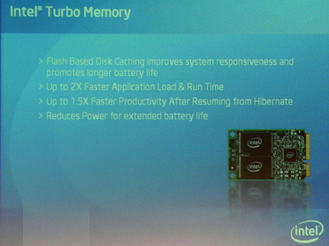 Intel Turbo Memory를 설명하는 슬라이드. 응용 프로그램 기동성은 배 가까이 된다고 한다. Mini PCI Express 버전 Intel Turbo Memory도 보인다
