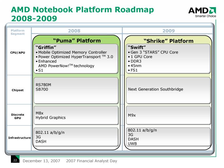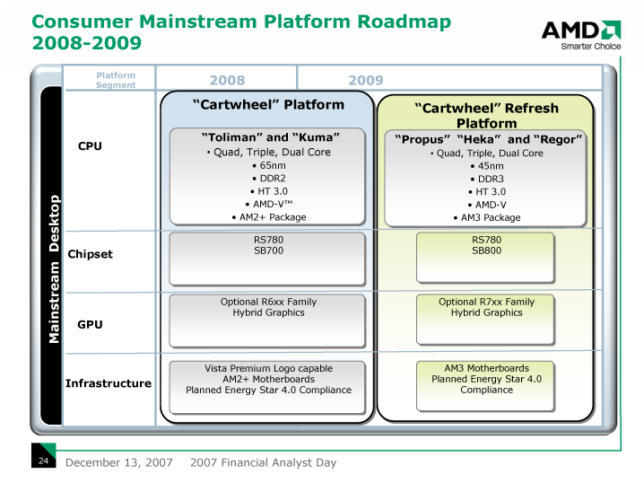 데스크탑 로드맵도 거의 평행하며, 내년에는 45nm 공정으로의 전환이 시작되고 2009 년에 Socket AM3에서 DDR3를 지원한다. AMD는 열성자용 플랫폼 이외에서는 평균 소비 전력을 규정하는 Energy Star 4.0을 준수할 예정임을 강조하고 있다. 모바일에 관해서는 최초의 FUSION "Swift (스위프트)"의 플랫폼 이름 "Shrike"가 붙여졌다.