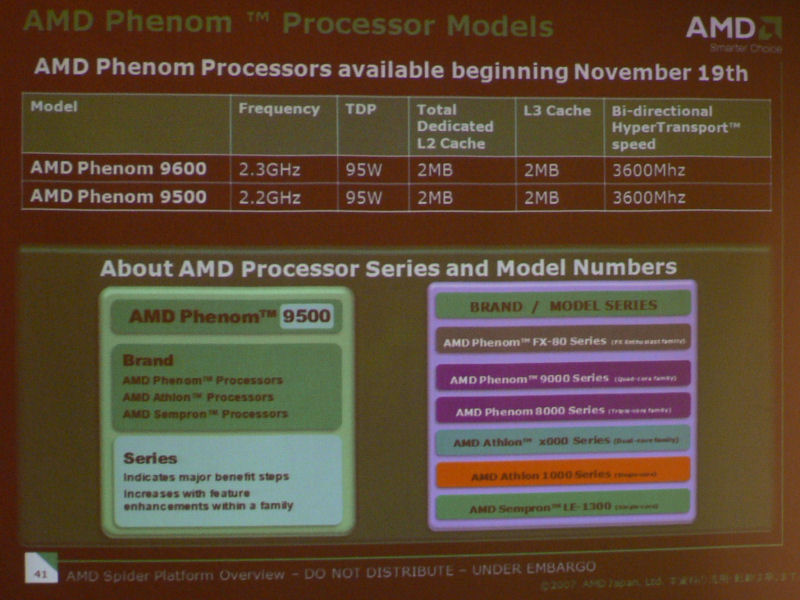 Phenom 9600은 코어 클럭 2.3GHz이고, 9500은 2.2GHz. 그 이외의 사양은 공통으로, TDP는 95W이다. 또한 4분기 중에 배율 고정을 해제한 2.3GHz 동작의 Black Edition, 2008년 1분기에는 2.4GHz 동작의 Phenom 9700 (300 달러 이하), 2.6GHz 동작의 동 9900 (350 달러 이하)가 발매되며, 트리플 코어 Phenom 8000 시리즈, 듀얼 코어 Athlon 6000 시리즈도 예정되어 있다.