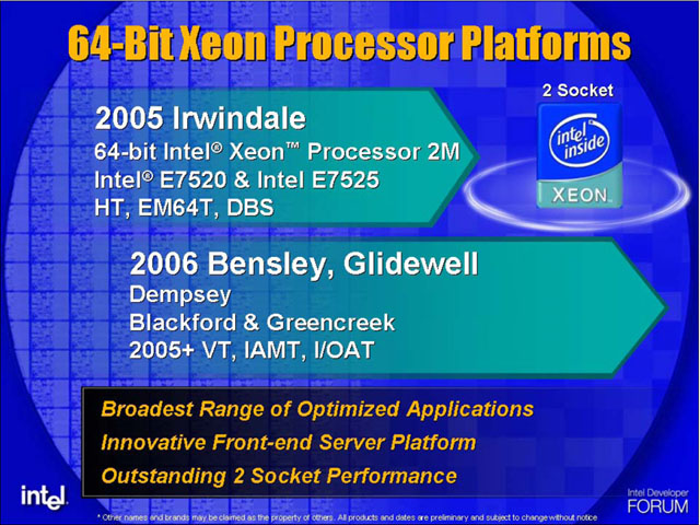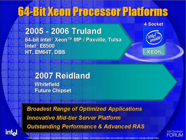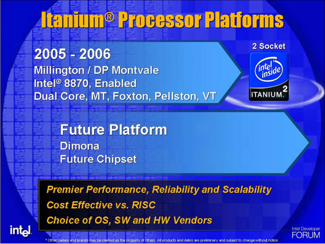 Gelsinger 부사장이 로드맵을 보여준 플랫폼 카테고리는 "Enterprise Client", "2 Socket 64bit Xeon", "4 Socket 64bit Xeon", "2 Socket Itanium", "≧ 4 Socket Itanium" 5개다.