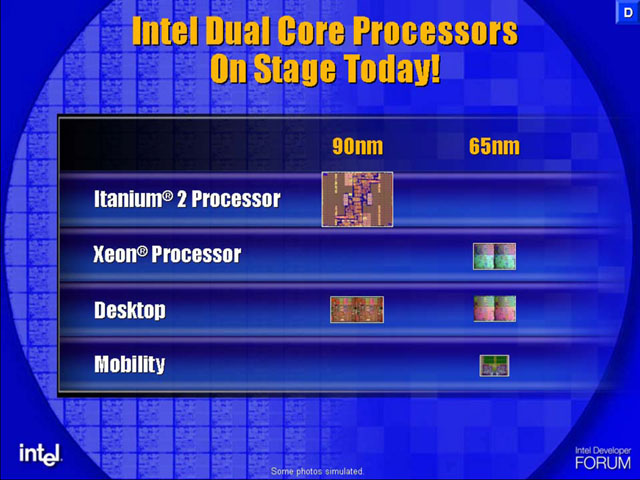 신제품 Dual Core 프로세서와 공정. 그림 중 좌상이 몬테시토. 이후 왼쪽에서 오른쪽, 위에서 아래 순으로 뎀프시, 스미스필드, 프레슬러, 요나 다