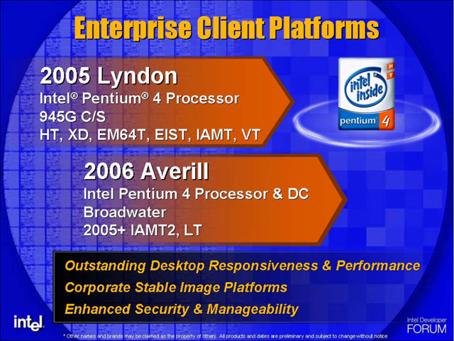 Enterprise Client Platforms은 2005년에는 Lyndon 플랫폼이 등장하고, 2006년에는 Averill 플랫폼으로 바뀐다. Lyndon 에서는 945G 칩셋이 채용되어 IAMT, VT에 대한 대응이 행해진다. 여기에 Averill은 IAMT가 업데이트 되어 IAMT2로 되고, LaGrande (LT)에도 대응한다. 2006년 이른바 Longhorn Time Frame이며, 그것에 맞춰 LT를 도입하는 것이다. 이 Averill에는 Broadwater 칩셋이 지원 할 예정이다. 이하 다른 플랫폼에 대해서는 표를 참조하기 바란다.