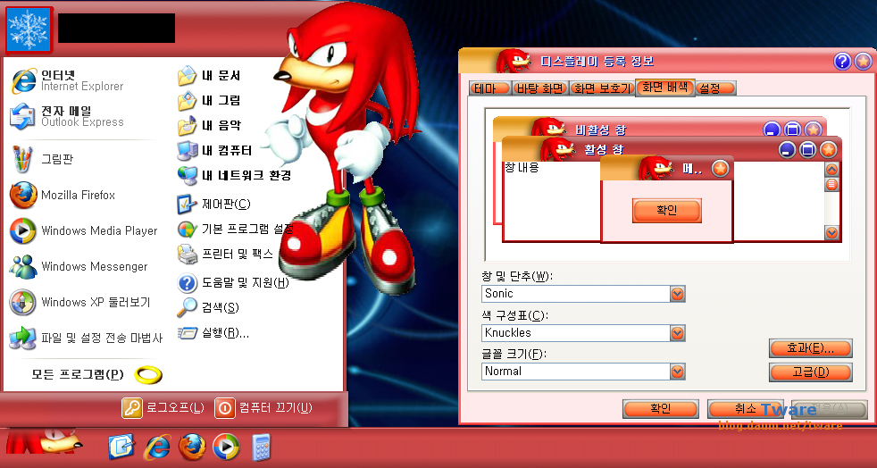 소닉테마 입니다. 적당한 폴더 또는 C:\Windows\Resource\Themes 폴더 또는 기타 폴더에 (D 드라이브 라던가) 압축을 풀어 넣어 두시고, 압축을 푼 Sonic.msstyles 를 더블클릭하여 실행하면, 아래와 같이 3가지 캐릭터별로 취향에 따라서 고를 수 있게 됩니다. (테마패처가 설치된 상태여야 합니다. 테마패처도 블로그에 올렸고 맨 아래에 링크.)
