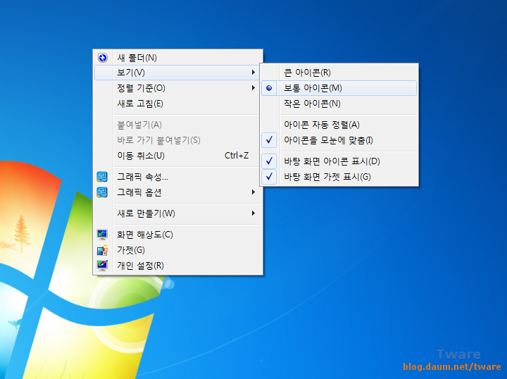 또는 바탕화면 마우스 우클릭 -> 보기 -> 보통 아이콘, 큰 아이콘, 작은 아이콘을 통해서도 크기를 바꿀 수 있습니다.