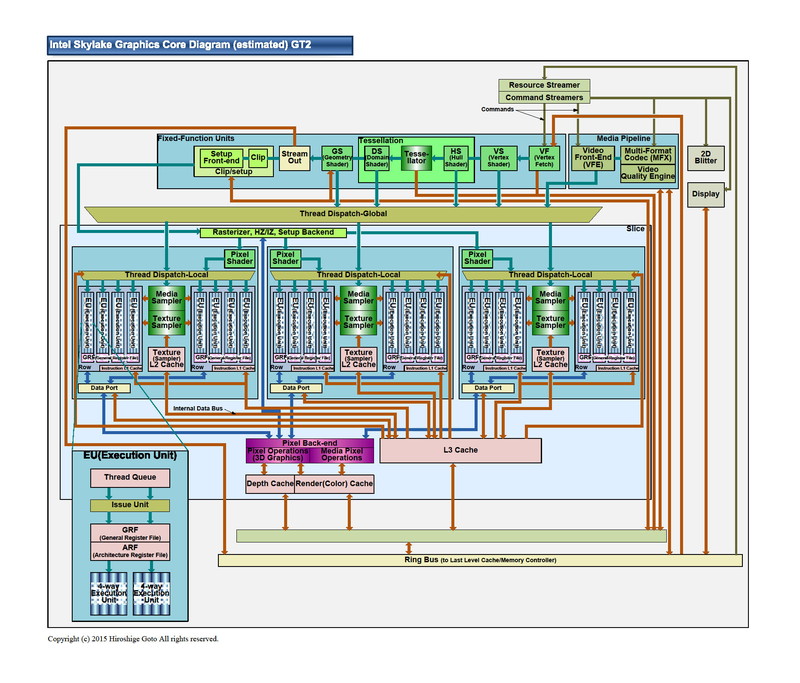 Skylake GPU 코어의 3D 그래픽스 엔진 부분의 매크로 레벨에서의 마이크로 아키텍처는, 실은 Broadwell 세대와 그다지 다르지 않다. 전체 구성으로 보면, 특별히 Skylake 세대에서 진화되지 않았다고 오해 할 정도다. 그만큼 Broadwell와 Skylake의 GPU 코어 구성은 비슷하다. 그렇지만 후술하는 바와 같이, 그 내용은 크게 다르다.