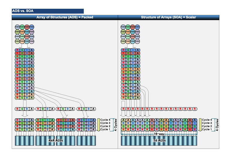 GPU는 벡터 프로세서이지만, 그 실행 모델은 크게 나눠 두 종류가 있다. 하나는 "Array of Structures (AOS)" 또는 "팩크드 (Packed)"라 부르는 방식. 또 하나는 "Structure of Arrays (SOA)"또는 "스칼라 (Scalar)"라 부르는 방식이다.