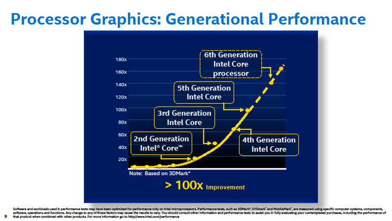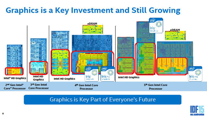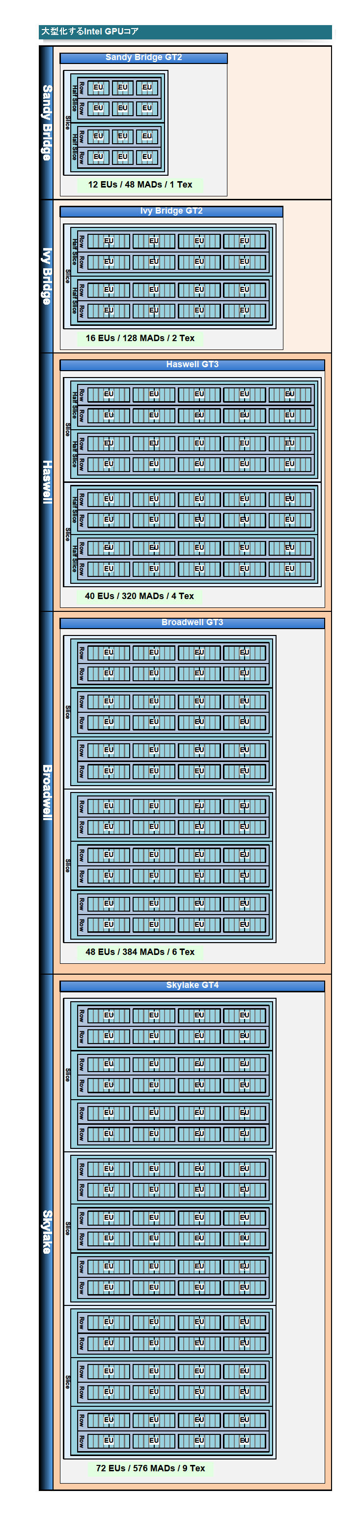 Intel도 AMD도 현재는 GPU 코어를 강화하는 길을 돌진하고 있다. Skylake 세대는 72 EU (execution unit) / 576 개의 적화산 유닛을 갖춘 거대한 GPU 코어 "GT4" 버전도 등장한다. Skylake 세대에서 마침내 Intel의 GPU 코어의 피크 연산 성능은 1TFLOPS를 넘어서게 된다. 아래는 각 세대 Intel 그래픽스의 최대 구성 코어의 연산 유닛 구성도다. Sandy Bridge 세대로 부터 5세대까지 Intel 그래픽스가 거대화 된 것을 알 수있다. (GT4의 클럭이 GT2와 같은 1.15Ghz 라면 1.324 Tflops, Xbox one GPU 1.310 Tflops)