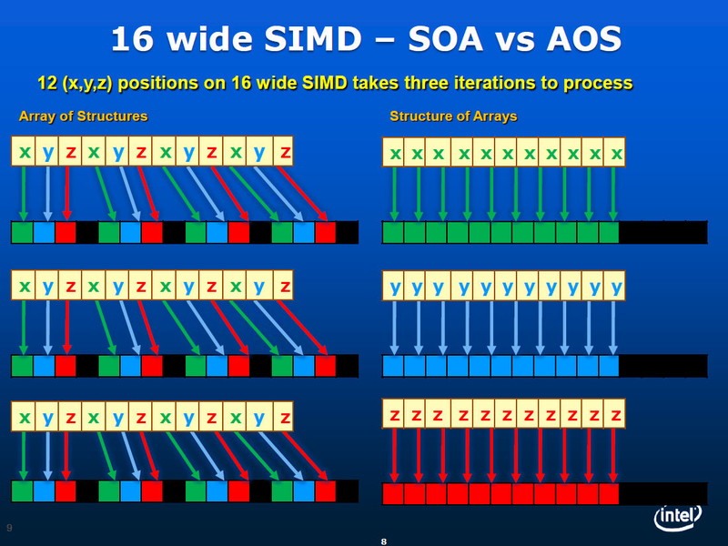 AOS / Packed 형에서는 데이터를 일정한 입도로 팩 하는 형태로 처리한다. SOA / Scalar 형에서는 마치 직렬 처리를 복수 묶은 형태로 처리한다. Intel CPU가 내장한 기존의 짧은 벡터 유닛 SSE / AVX는, 기본적으로 AOS / Packed 형의 실행 모델이다. 그에 비해 현재 NVIDIA나 AMD의 GPU는 SOA / Scalar 형의 실행 모델에 특화되어 있다.