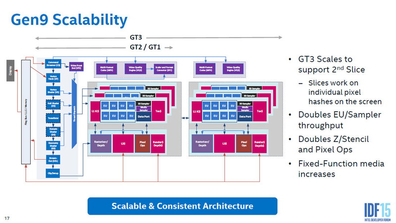 Intel은 GPU 코어를 블럭화 하고 있다. 우선 크게 나누면 GPU 코어 전체에서 공유하는 "언 슬라이스 (Un-Slice) "와 미디어 엔진 군, GPU 코어 속에서 확장 가능한 병렬화 한"슬라이스 (Slice)"로 크게 구분된다. 슬라이스 부분을 늘리는 것으로 GPU 코어의 규모를 대형화 가능한 구조로 되어있다.