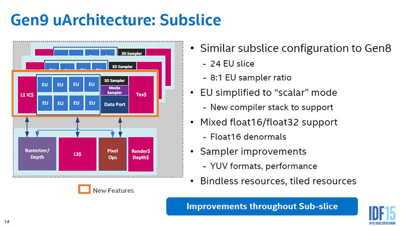"기존의 EU는 짧은 벡터 모드 (AOS / Packed 형)와 순수 스칼라 (SOA / Scalar 형) 모드 양방을 지원했다. 2계통의 모드에서 SIMD4x2, SIMD1x8, SIMD1x16, SIMD1x32 등 다양한 포맷이 있었다. 그래픽스 코어의 처리 중, 지오메트리 프로세싱은 짧은 벡터 모드를 사용하고 있었다. 픽셀 프로세싱과 GPGPU는 순수 스칼라 모드를 사용했다. 몇 미디어 프로세싱도 스칼라 모드였다. 그러나 Skylake 부터는, 전체에 대해서 항상 스칼라 모드를 사용하게 되었다. 따라서 컴파일러 스택도 Skylake에서 전부 바꿔 만들었다."