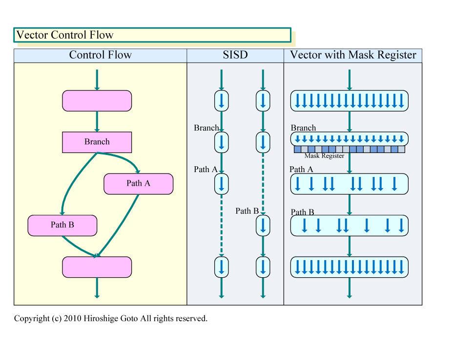 SOA에서는 16 레인에서 16 쓰레드가 모두 같은 명령을 실행할 필요가 있다. 따라서 스레드에 의해 명령 흐름이 분기하는 경우에는 문제가 생기고 만다. 따라서 SOA를 전제로 하는 광폭 벡터 유닛에서는 마스크 레지스터를 통한 프레디케이션을 행하는 것이 일반적이다.
