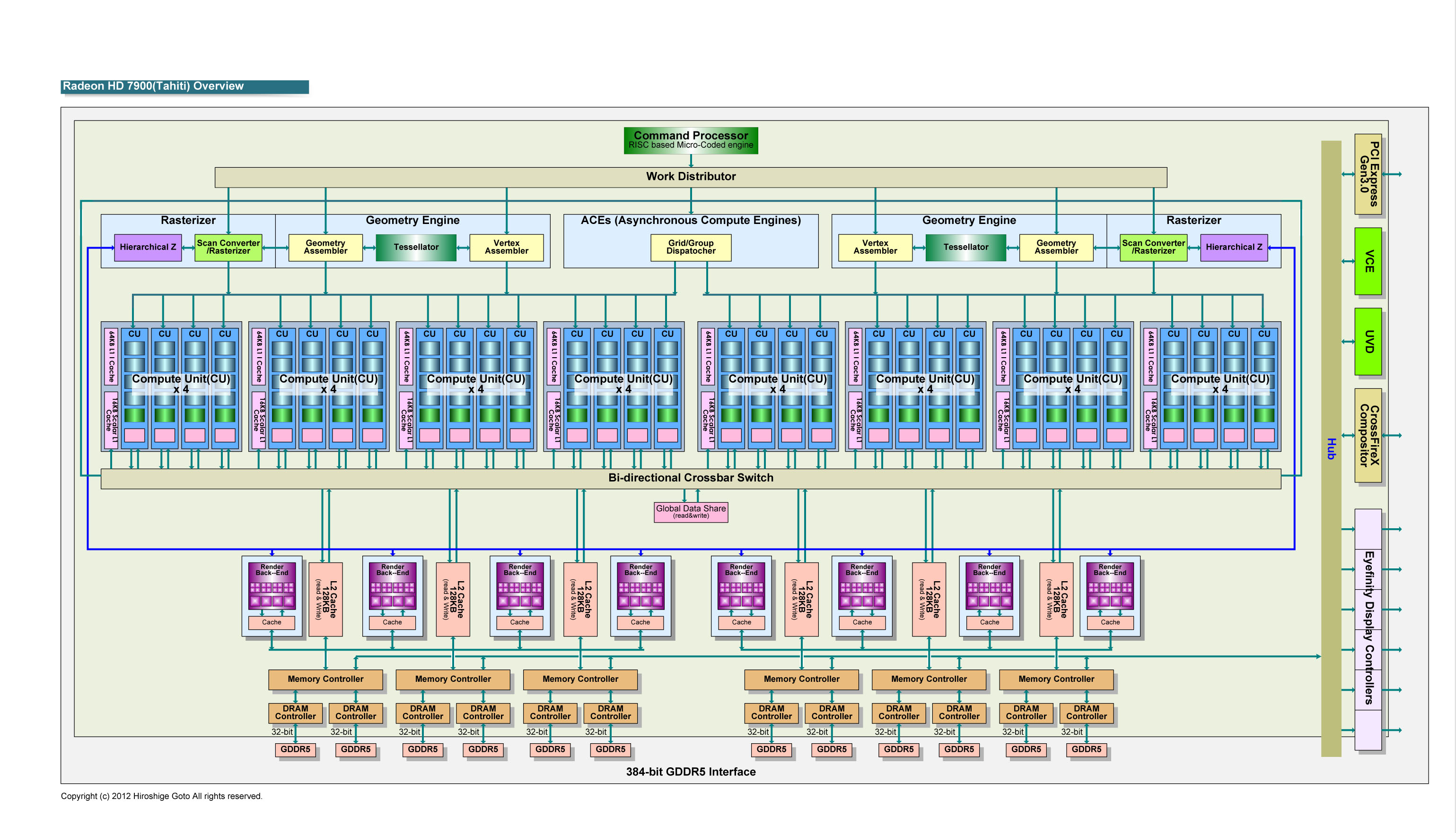 Tahiti (Radeon HD 7900)의 구조는, 각 프로세싱 클러스터 내부와 GPU 전체 구조의 모두 NVIDIA의 Fermi와 비슷하다. 프로세싱 클러스터 내부에는, 16레인 벡터 유닛이 복수 구현되어, GPU 전체는 다수의 프로세싱 클러스터로 분할되어 있다. 각 클러스터는 개별적으로 동작하고, 메모리는 쌍방향 크로스바 스위치와 읽기와 쓰기가 가능한 캐시 계층으로 묶여있다. 아래는 Tahiti의 전체 그림과 Fermi의 GF100 / GF110의 전체 그림이다.