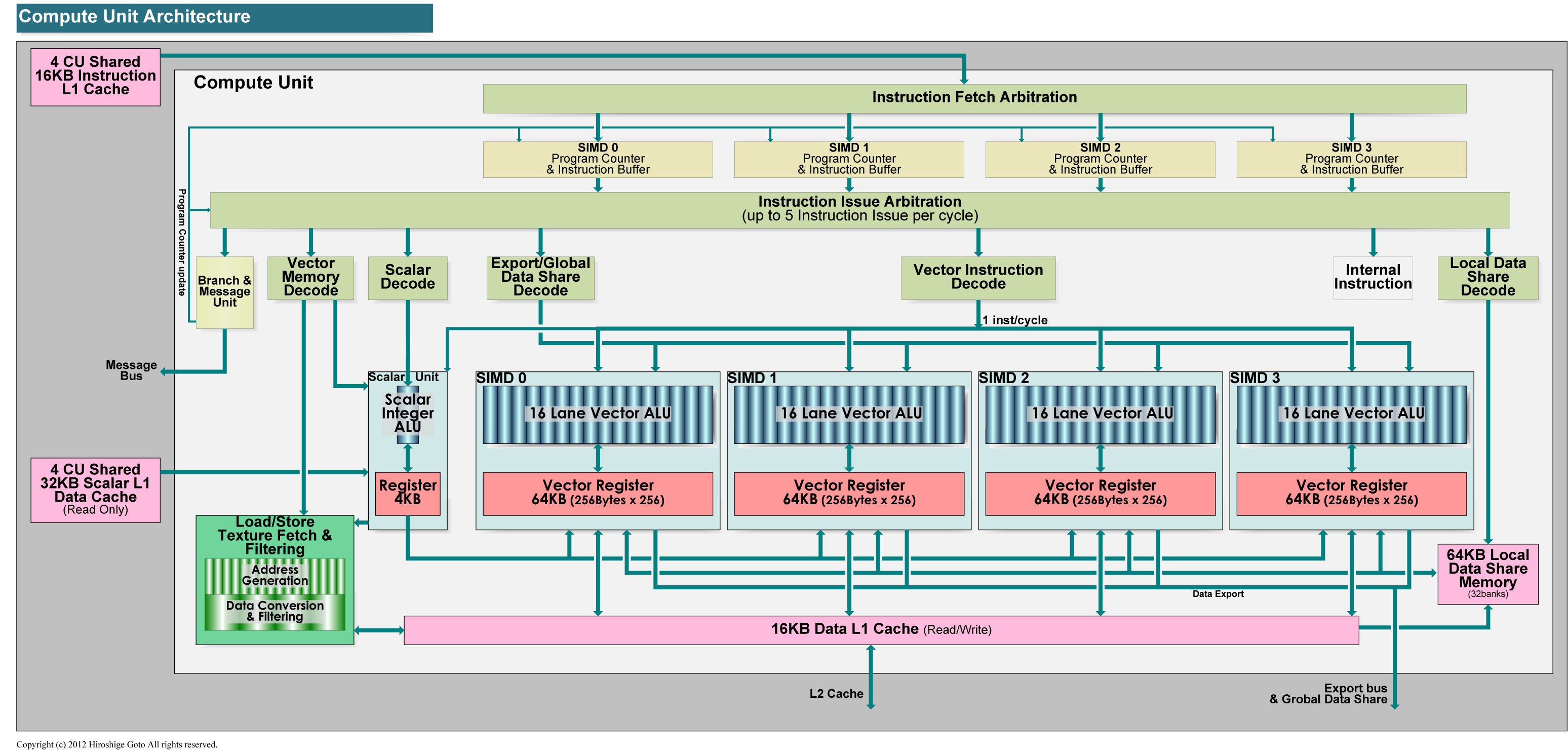 AMD가 Tahiti에서 채용한 GCN 아키텍처에서, GPU는 "컴퓨트 유닛 (Compute Unit : CU)"이라 부르는 프로세서 클러스터로 구성된다. 컴퓨트 유닛은 연산 유닛, 로드 / 스토어 & 텍스처 유닛, 캐시 및 로컬 스크래치 패드 메모리, 명령 유닛을 갖춘 풀 프로세서이다. 아래의 그림은 CU (Compute Unit)의 전체다.