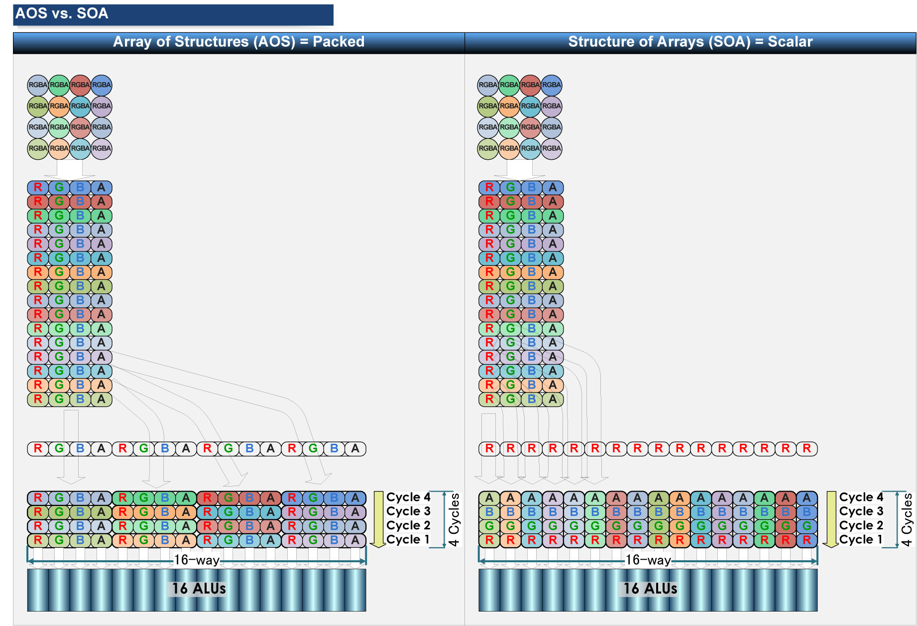 벡터 유닛 사용법에는 두가지 방법이 있다. "Array of Structures (AOS)" 또는 "팩크드 (Packed)"라는 방식과 "Structure of Arrays (SOA) "또는 "스칼라 (Scalar) "라고 부르는 방식이다. 아래의 그림처럼 벡터 유닛상에서 어떤 정렬 방식으로 데이터를 다루는지가 다르다.
