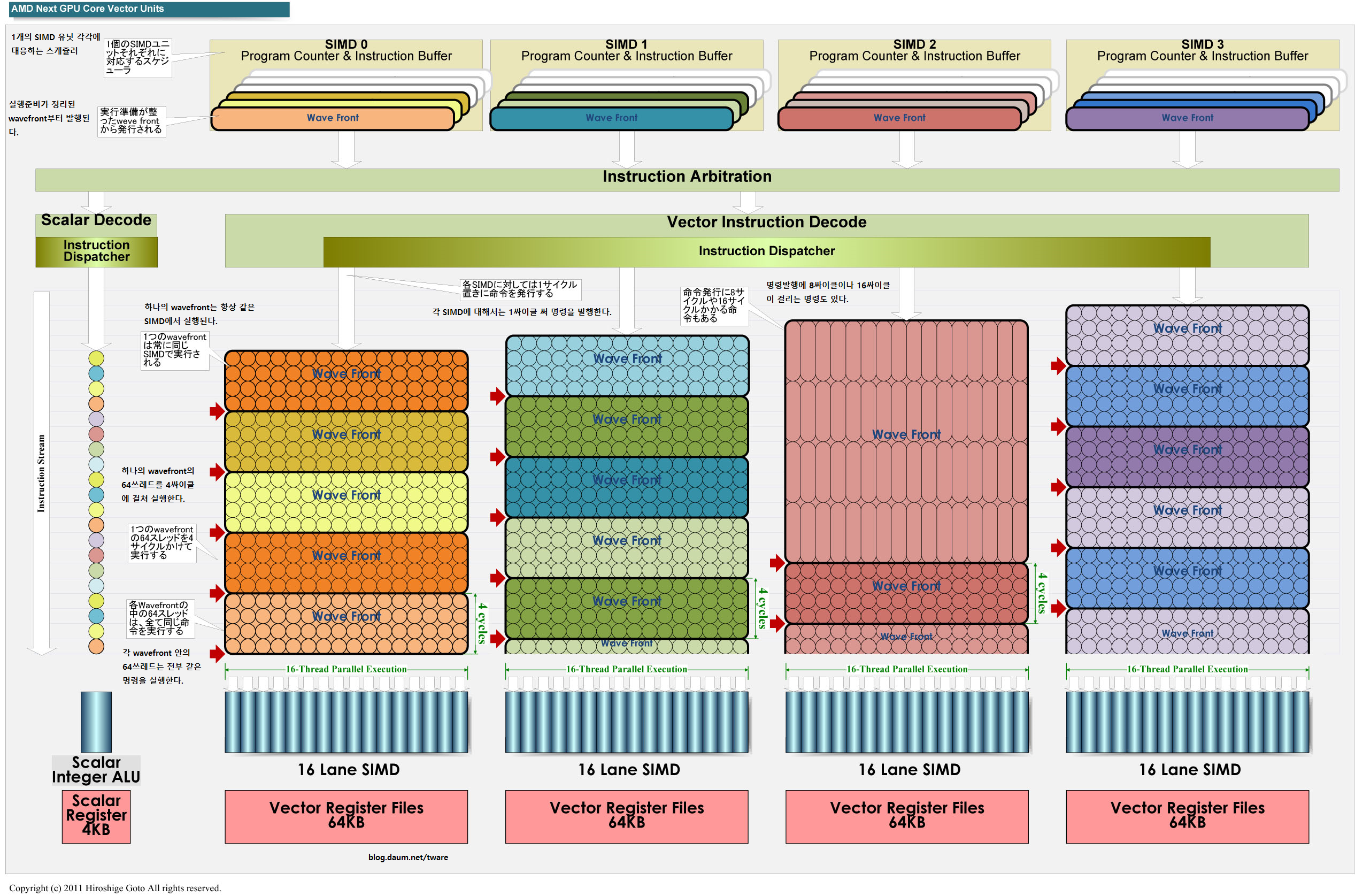 다음으로 페치한 명령을 네개의 명령어 버퍼에 배분한다. 그림 중에서 "SIMDx Program Counter & Instruction Buffer"라 되어있는 4유닛이 그것이다. AMD GPU에서는 Wavefront 라고 부르는 64 스레드의 일괄처리 단위로 처리를 한다. 즉, 물리적 유닛 벡터 길이는 16 레인이지만, 논리적인 벡터 길이는 64레인 분이다. 명령 유닛의 명령 버퍼와 프로그램 카운터는 64 스레드의 묶음인 Wavefront 단위로 제어한다.