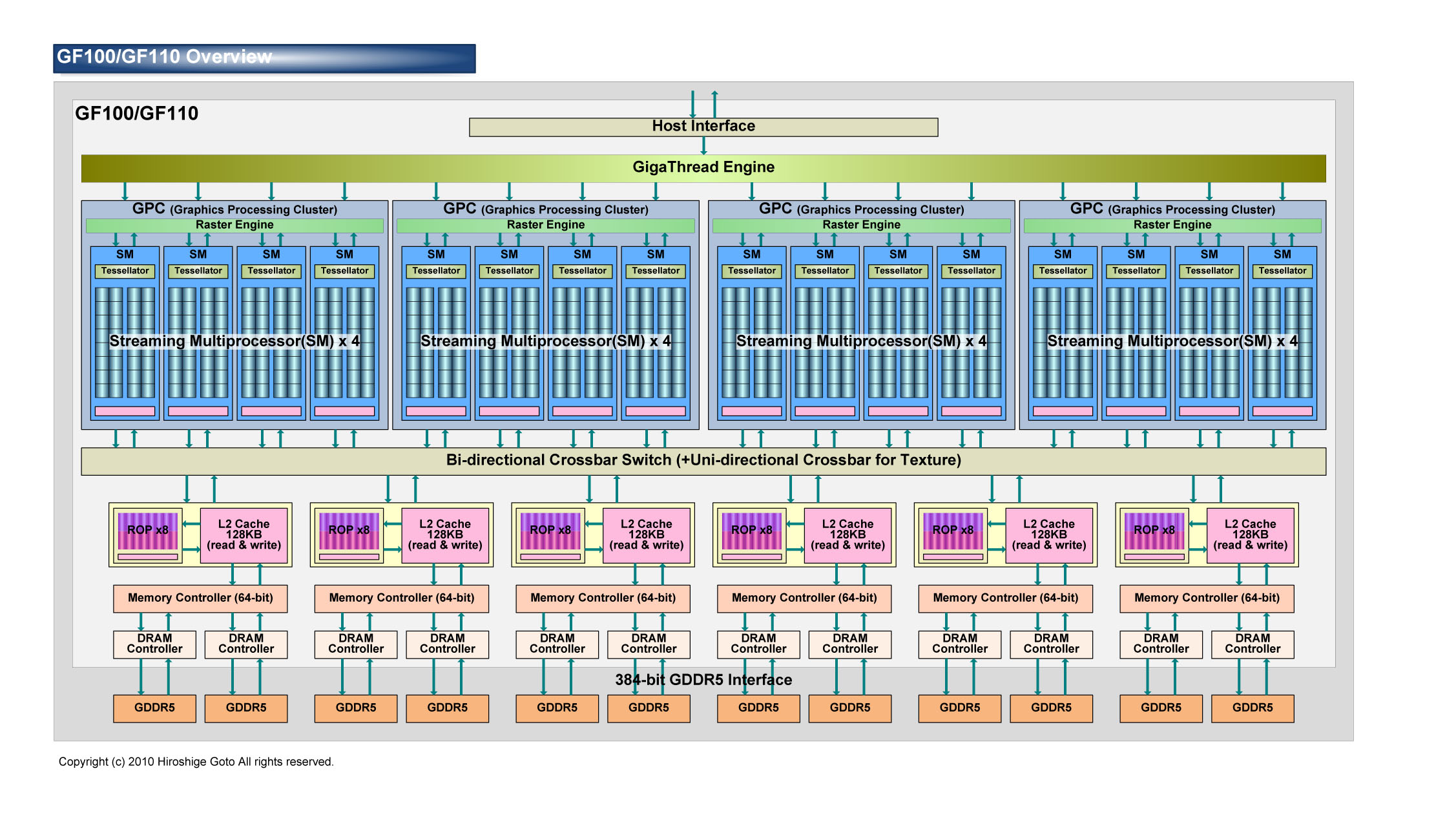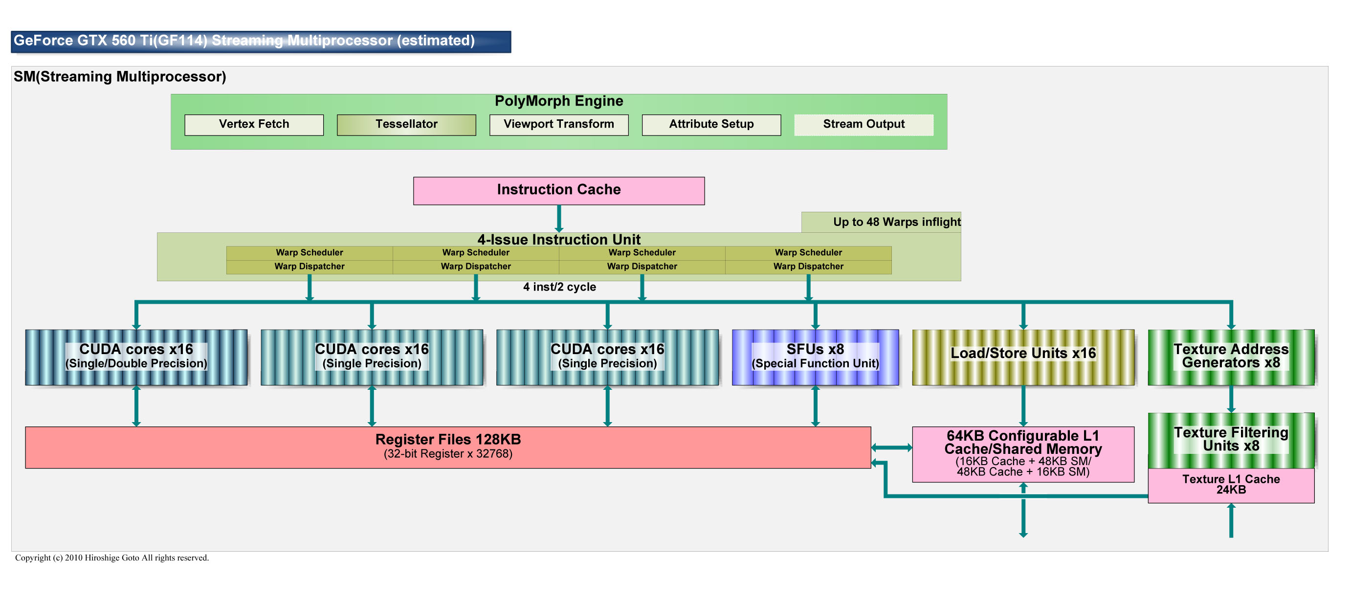 여기서 재미있는 것은, Tahiti의 CU (Compute Unit)가 NVIDIA의 Fermi 아키텍처의 프로세서 클러스터인 SM (Streaming Multiprocessor)과 비슷한 것이다. 아래는 Fermi의 GeForce GTX 560 Ti (GF114) 계의 SM 블록도다. 모두 16레인 벡터 유닛을 복수 갖추고, 명령 유닛에서 복수의 스레드 명령을 동시에 발행한다. 기본 구조는 아주 비슷하다.