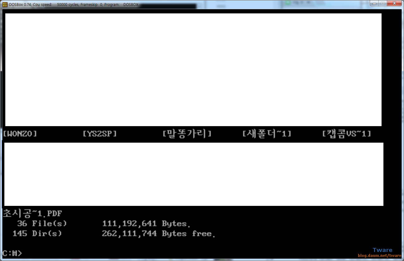 여기서 dir 명령을 친다면 도스박스에서의 c: 드라이브의 폴더와 파일, 파일의 크기가 쭉 나오겠죠.