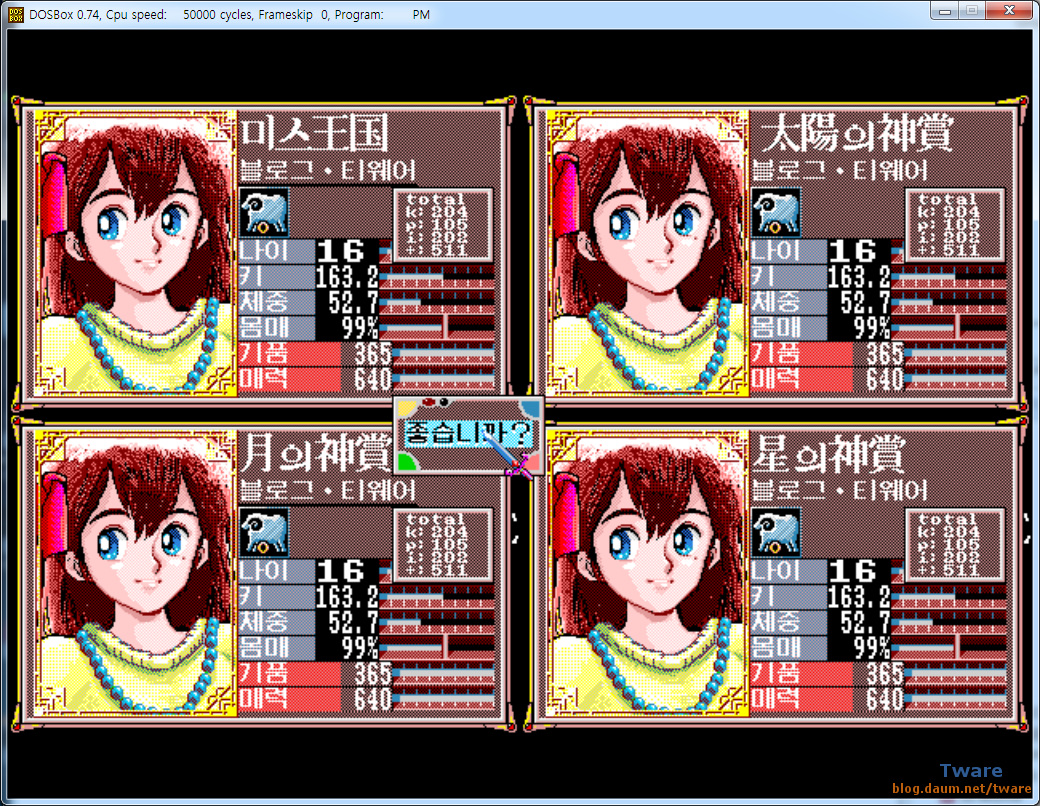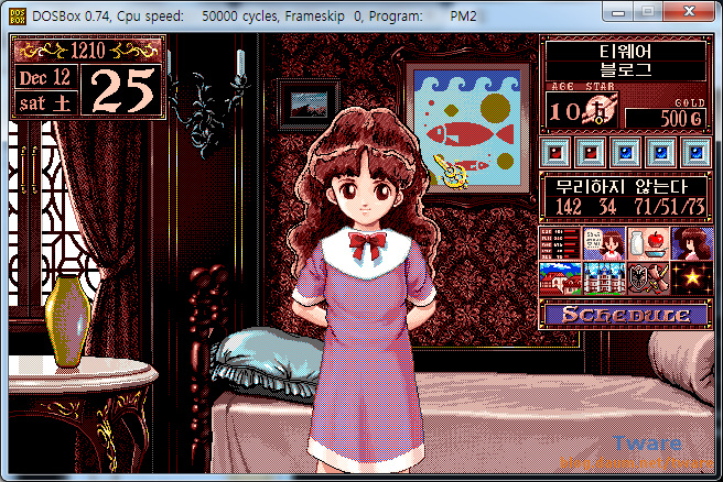 이렇게 바로 가기를 만들어 주고 단축 아이콘을 실행하면, 프린세스 메이커 전용 pm2.conf 파일 셋팅으로 게임이 실행되며, 게임 종료시 창도 자동으로 꺼집니다. 예전에 제가 마눌이 컴에 프린세스 메이커2 를 이렇게 설정해줬습니다. 도스 명령어를 전혀 몰라도 그냥 윈도용 프린세스 메이커 2 처럼 하고 종료할 수가 있으니까요. 예전 윈도용 프메2는 창모드만 지원 됐었기 때문에, 이렇게 해서 바로 전체 화면으로 실행 되도록 말이죠. 또 게임을 그만두면 자동으로 도스박스도 꺼지게요.
