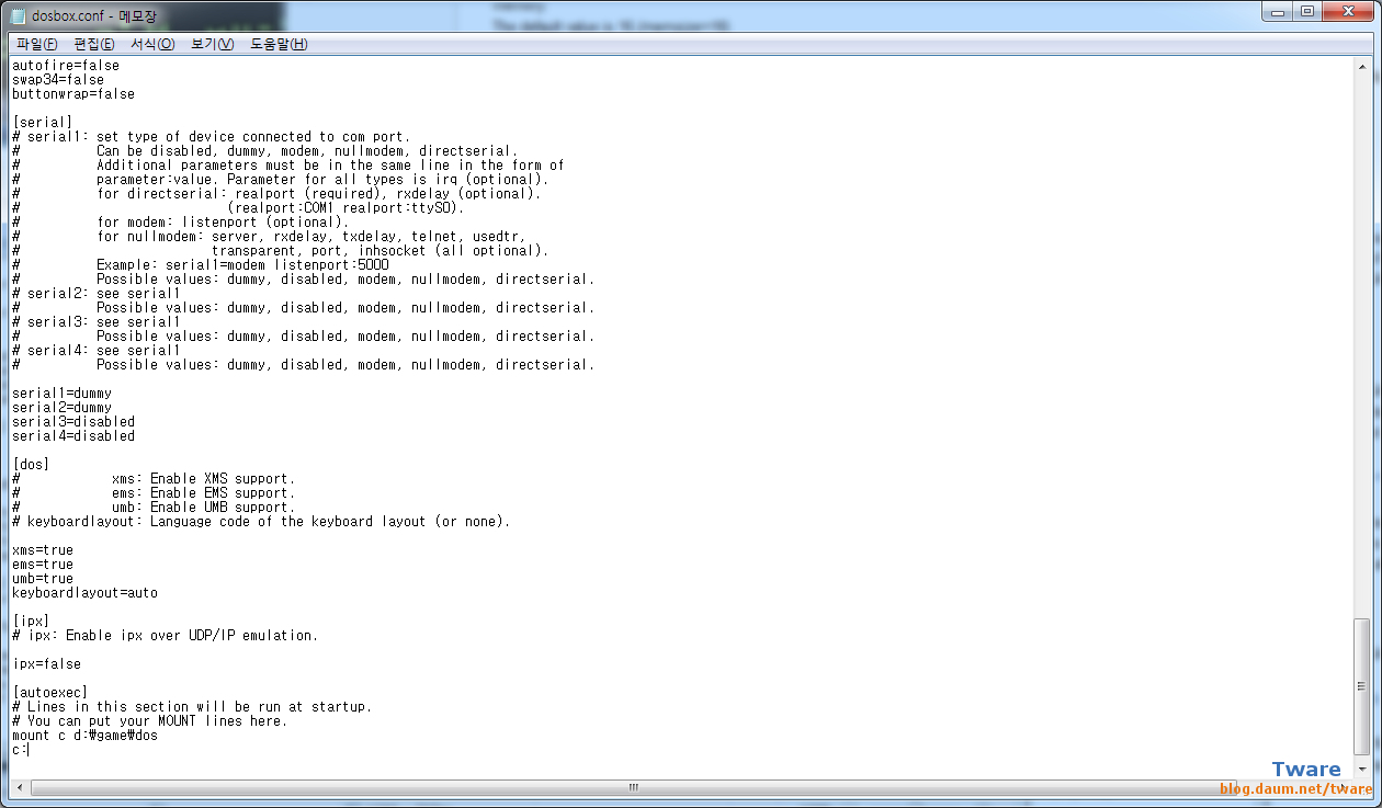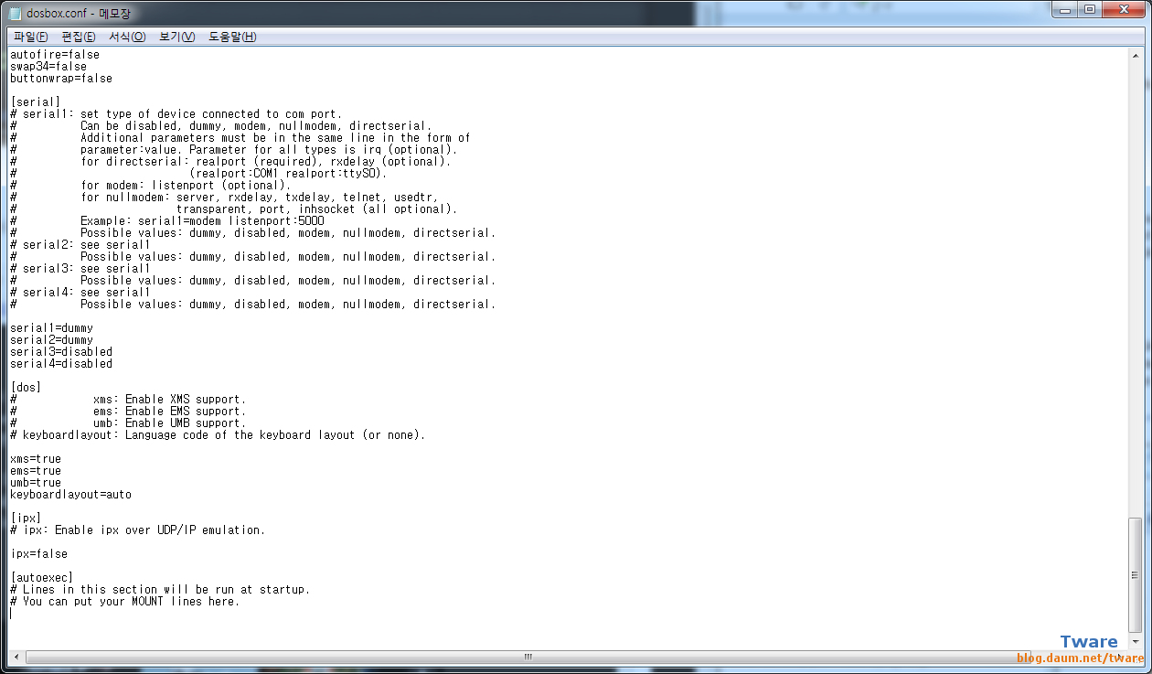 (도스박스의 dosbox.conf 파일은 마치 실제 도스의 config.sys 파일의 설정이라고 할 수도 있습니다. 더 정확히는 config.sys + autoexec.bat 파일 이라고 할수 있겠죠.)