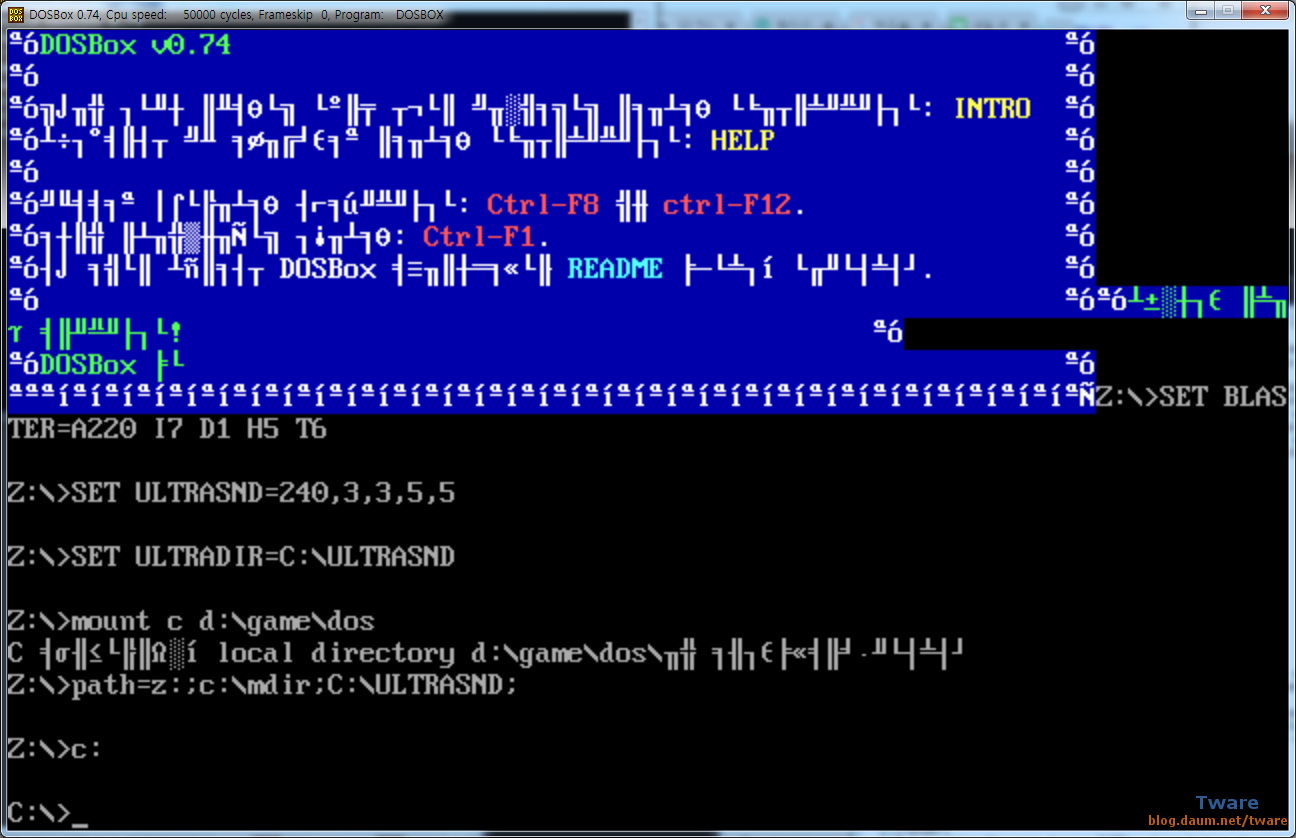 (도스 박스가 실행된 상태에서 윈도우에서 d:\game\dos 폴더에 새로운 도스 게임폴더를 넣어도 도스박스에서는 보이지 않습니다. 도스박스를 끄고 재 실행하거나, 또는 "rescan c:" 라고 쳐서 다시 읽어줘야 도스박스에서 보입니다.)
