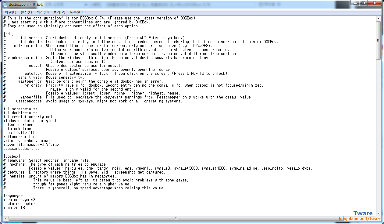 이렇게 생성된 dosbox.conf 파일은 윈도우 메모장으로 열어서 설정값을 바꾸고 저장하면 됩니다.