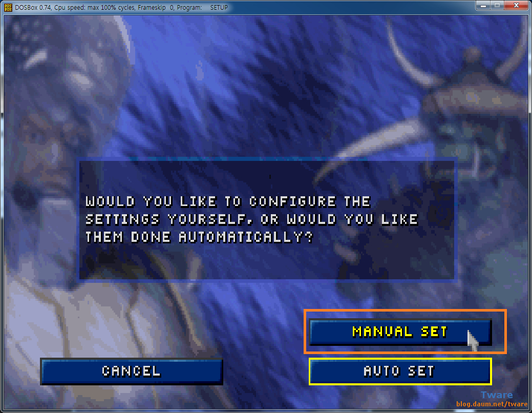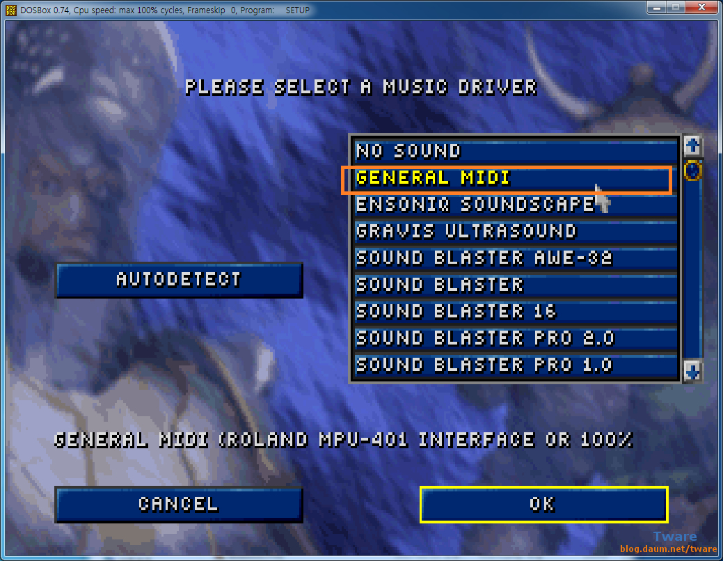 도스박스 글이지만, 여기에 슈퍼 스트리트 파이터2 터보를 올려놓고 보니까, 알았던 몰랐던 간에 직접 설치해서 플레이 해보고 싶은 분들이 계시겠죠. 그래서 SSF2T에 관해서 약간의 추가 설명을 넣습니다. 도스용 슈퍼 스트리트 파이터2 터보 CD 버전을 설치하고 게임을 하면 여러 문제들이 있습니다. 그래서 반드시 패치를 해줘야 하는데요. (저도 저 위에 미디로 한 동영상 패치 전 입니다. 패치를 하고 나면, 사운드 캔버스와 MPU-401도 고를 수 있게 됩니다. 패치후 도스박스에서 setup 에 들어가면 고를 수 있습니다.)