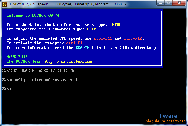 그런데, 도스박스 프로그램은 설치된 프로그램을 다른 PC로 옮겨서, 또는 윈도우즈 재 설치 등을 할때 윈도우즈와 다른 드라이브에 설치해 뒀다면, 그대로 다시 사용할 수 있는데, 이때 dosbox.conf 파일이 도스박스를 설치한 폴더에 없는데, 이건 만들어서 사용하면 됩니다.