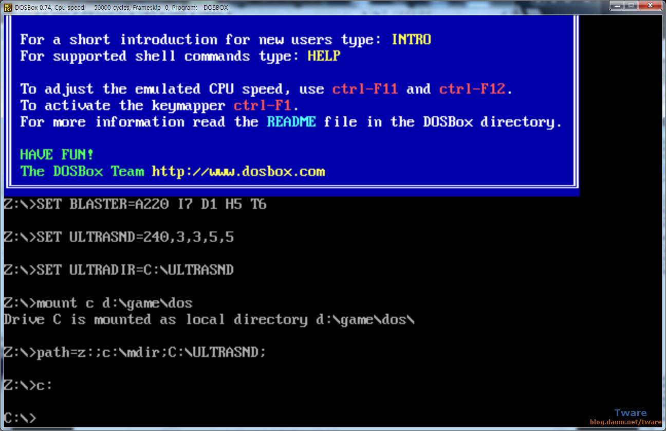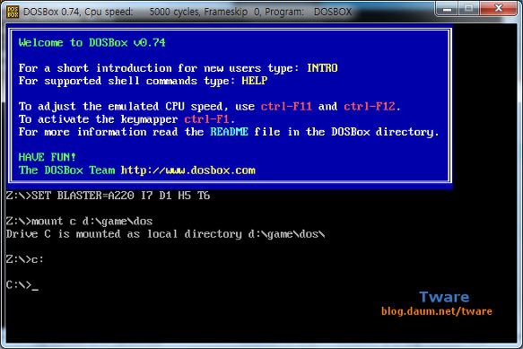 도스 박스를 다시 시작하면 자동으로 윈도우즈의 d:\game\dos 폴더가 c: 드라이브로 되고, c: 드라이브로 이동이 자동으로 됩니다.