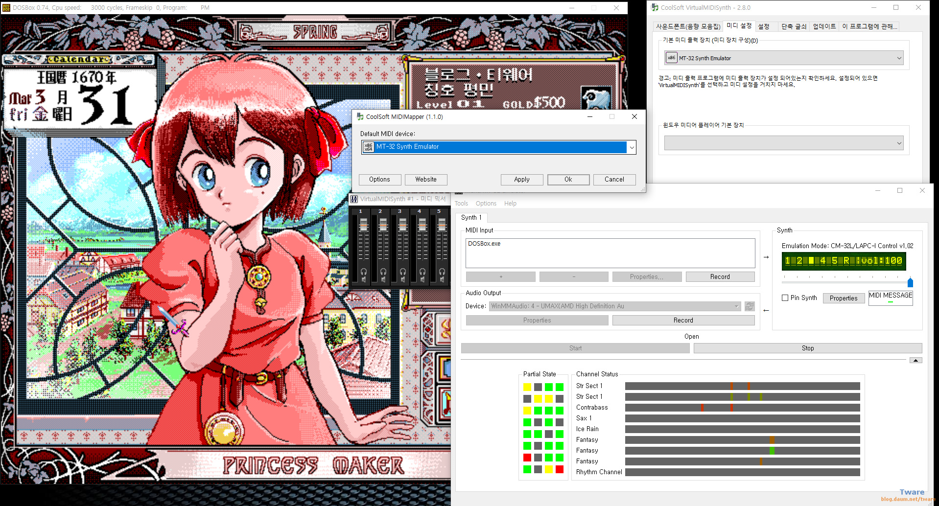 여기까지 알게 됐으면, 더 확장해서 생각 할 수 있겠죠. 도스박스의 기본 설명에서 게임마다 좋은 값이 다를 수 있다고 했습니다. 어떤 게임은 opengl이 좋을수도 있고, 사운드가 좀 지연되도 끊기지 않게 듣는게 중요하고, 타이밍에 민감하지 않은 시뮬레이션 이라면 사운드의 블럭 사이즈 값을 크게 준다던가, 프리버퍼를 크게 준다던가, .conf 파일의 여러 설정에서 각 게임마다 최적화 된 값을 찾을 수도 있을 겁니다.