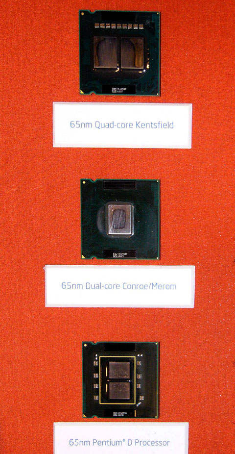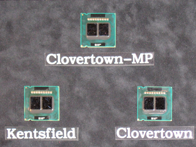 이 밖에 오늘은 쿼드코어 "Kentsfield (켄츠필드)"를 포함, 각 CPU의 실물이나 동작 데모도 공개했다. 쿼드코어 CPU는 데스크탑의 Kentsfield, DP (Dual-Processor)의 "Clovertown (클로버타운)" 거기에 MP (Multi-Processor)용 Tigerton (타이거톤)으로 보이는 Clovertown-MP로 라벨 붙은 CPU 3종류. 모두 2개의 CPU 다이 (반도체 본체)를 조합한 멀티 다이 패키지로 되어 있다.