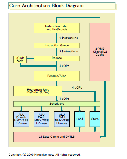 아래가 Intel에서 정식으로 공개된 Core Microarchitecture의 블록 다이어그램 그림이다. 연산 유닛 배열에는 ALU 군이 3그룹과 로딩이 1, 스토어 유닛이 1의 합계 5 그룹이 나란히있다. 연산계 유닛은 3유닛 각각이 정수 연산 스칼라와 MMX / SSE 유닛을 포함, 부동 소수점 연산은 더하기 (FAdd)와 곱셈 (FMul)이 각각 다른 명령 발행 포트에 배치되어 있다. 분기는 왼쪽 첫번째의 유닛에만 구현되어 있다.
