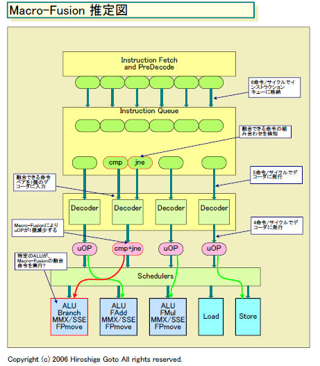 가장 큰 토픽은 Macro-Fusion의 내용이다. 이번에는 Macro-Fusion 에서는 x86 명령 중 비교 명령인 cmp 또는 test와 조건 분기 명령 (jcc)의 조합을 융합시키는 것이 밝혀졌다. 이전 기사에서 추측한 만큼 복잡한 융합을 행하지는 않는 것 같다. 이 두 명령은 명령 스트림 속에서 거의 확실히 이어진다. 따라서 융합시키려면 연속하는 2명령이 융합 가능한지 어떤지를 체크하면 좋다고 보인다.