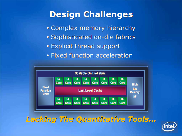 어플리케이션의 유형에 따라서, 유효한 캐시의 조직과 관리 방식도 달라진다. 예를 들어, 스트림 형의 데이터 처리의 경우에는, 전통적인 범용 CPU의 캐시 계층은 방해가 된다. 단순한 데이터를 앞서 읽는 버퍼가 가장 효과적이다. Rattner 씨의 발언은 캐시 관리 테크닉 자체를 프로그래밍 가능하게 해서, 스트림 유형의 응용 프로그램 등에도 최적화 할 수 있도록 하는 것을 시사하고 있다.