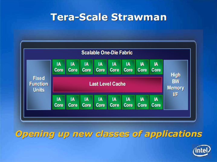 Intel의 Tera-Scale 컴퓨팅에서는, CPU 코어의 배열은 다수의 IA (Intel Architecture) CPU 코어를 늘어 놓은 구조가 보인다. Rattner 씨는 매니코어 시대의 IA 코어는, 현재 IA 코어의 풍부한 특징을 그대로 갖는다 설명을 이전부터 했다. 이 구상은 지금도 변함 없다.