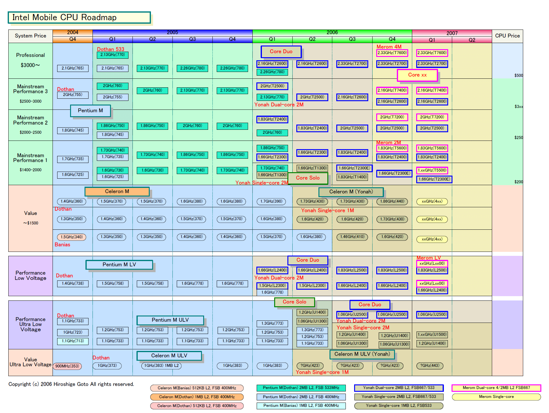 T는 기존의 통상 전압판 모바일, L이 LV (저전압) 판, U가 ULV (초 저전압) 판의 위치이다. 현재는 T / L / U는 주로 모바일 용으로 Yonah와 Merom, E 부터 위가 Conroe 이다. 실제로는 Merom과 Conroe는 같은 코어이므로 두 CPU의 코드 네임의 차이는 파워 클래스의 차이와 같다. 덧붙여서, Conroe와 Merom을 동렬로 나열하면 아래와 같다.