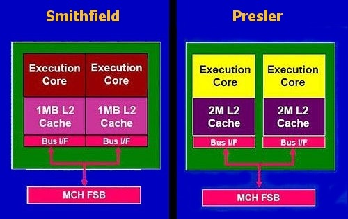 Conroe와 Presler에 의해서 Intel의 듀얼코어 이동에 박차가 가해진다. Intel의 듀얼 코어 이행 가이드라인에 따르면, 2006년 1분기에는 성능 & 메인 스트림 & 밸류 CPU 중 듀얼 코어의 비율은 약 10% 이지만, 2분기에는 약 25%, 3 분기는 약 60% 미만, 4 분기에는 약 70%로 증가하는 계획이 있다.