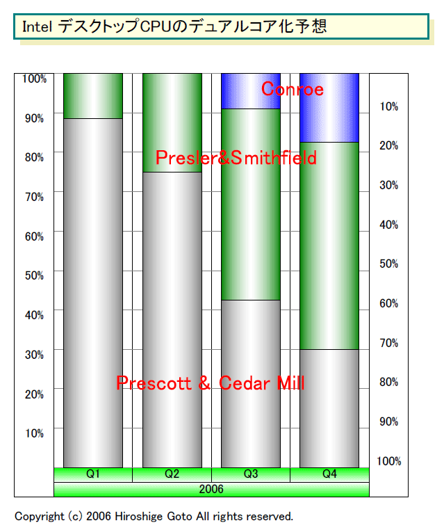 Intel은 2004년 9월 시점에는, 데스크탑 CPU의 성능 & 메인 스트림 계는 2006년까지 40% 이상이 듀얼 코어로 이행한다고 예측했다. 그러나 2004년 12월에는 전략을 완전히 바꿔, 2006년 중에 70% 이상이 듀얼 코어로 이행한다고 선언했다. 2004년 말 때의 계획대로 진전되고 있는 것이다.