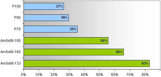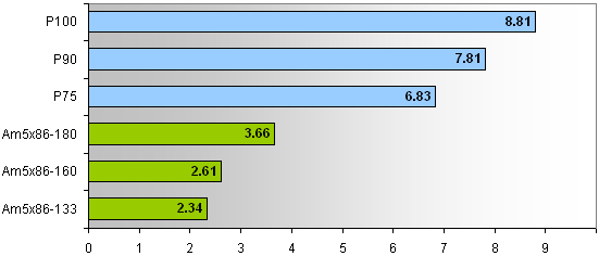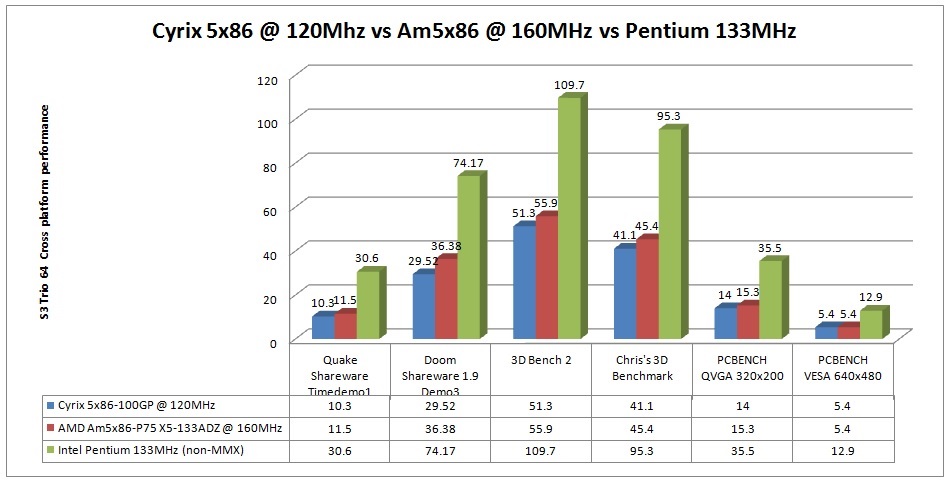 당시 3D 처리에 FPU 성능이 중요하기 때문에 이런 차이가 발생 합니다. 인텔에 비해 타사의 CPU는 FPU 성능이 매우 낮습니다. 펜티엄과는 급이 다르구요. K7에 와서야 펜3와 동급 또는 이상이 됩니다. 특히나 Cyrix쪽이 가장 떨어졌죠. 또 이 세대는 펜티엄 세대냐 486 세대냐의 차이도 있죠. 펜티엄은 슈퍼스칼라 아키텍처, 486은 스칼라 아키텍처. 스칼라 프로세서는 한번에 1명령 실행, 슈퍼 스칼라 아키텍처는 아키텍처에 따라서 2명령 이상 실행. 펜티엄은 최대 (말 그대로 최대, 항상이 아닌) 2명령 실행. 5x86은 이름만 586이지 486 프로세서. 3D 그래픽 카드가 나오면서 게임에서 FPU 성능의 중요성이 점차적으로 감소. 다만 3D 카드 시절에도 한동안 계속 FPU (또는 SSE)가 그래픽 효과 처리에 이용 되기에 어느정도는 중요 합니다.
