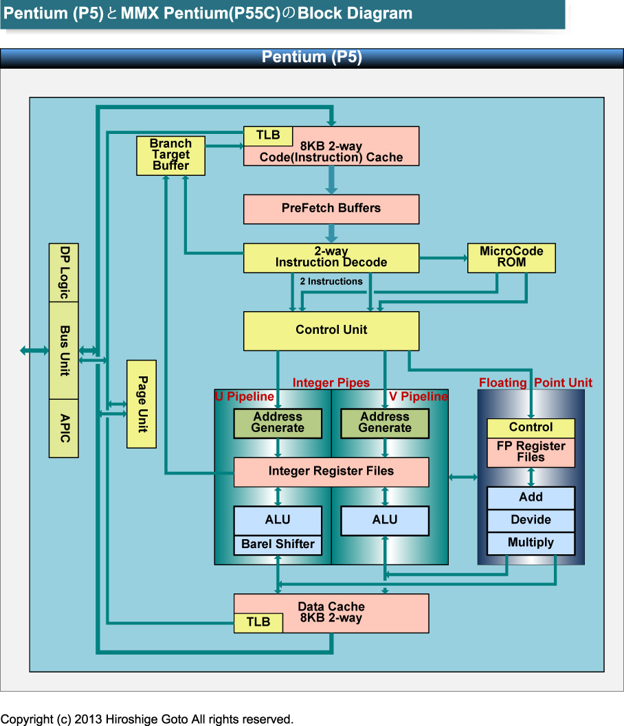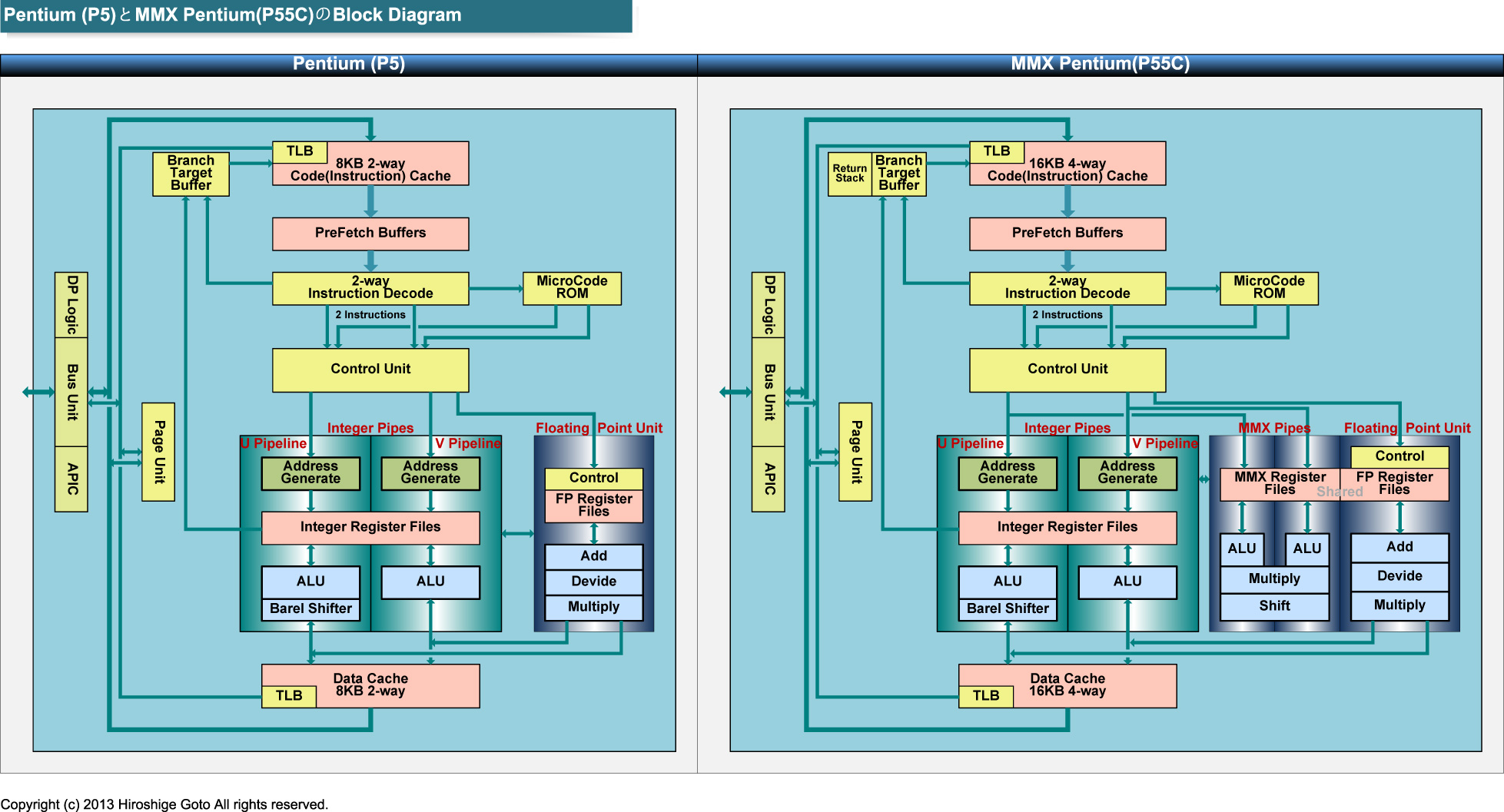 Pentium MMX (P55C)와 초대 Pentium (P5)의 블록 다이어그램