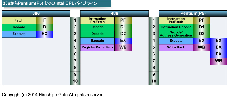 Intel은 4004로 세계 최초의 마이크로 컴퓨터를 발표한 이래, MPU (CPU)를 진화시켜 왔다. 16-bit 8086은 널리 채용되어 PC 시대의 기초를 쌓았다 (8088은 8086의 보급형). 그 후는 "80286 (286)"을 거쳐서 "386 (80386)"에서는 x86 명령을 32-bit로 확장했다. 386 명령어 페치 (인출) -> 명령 디코드 -> 명령 실행의 간단한 3 스테이지 파이프 라인 구성이었다.