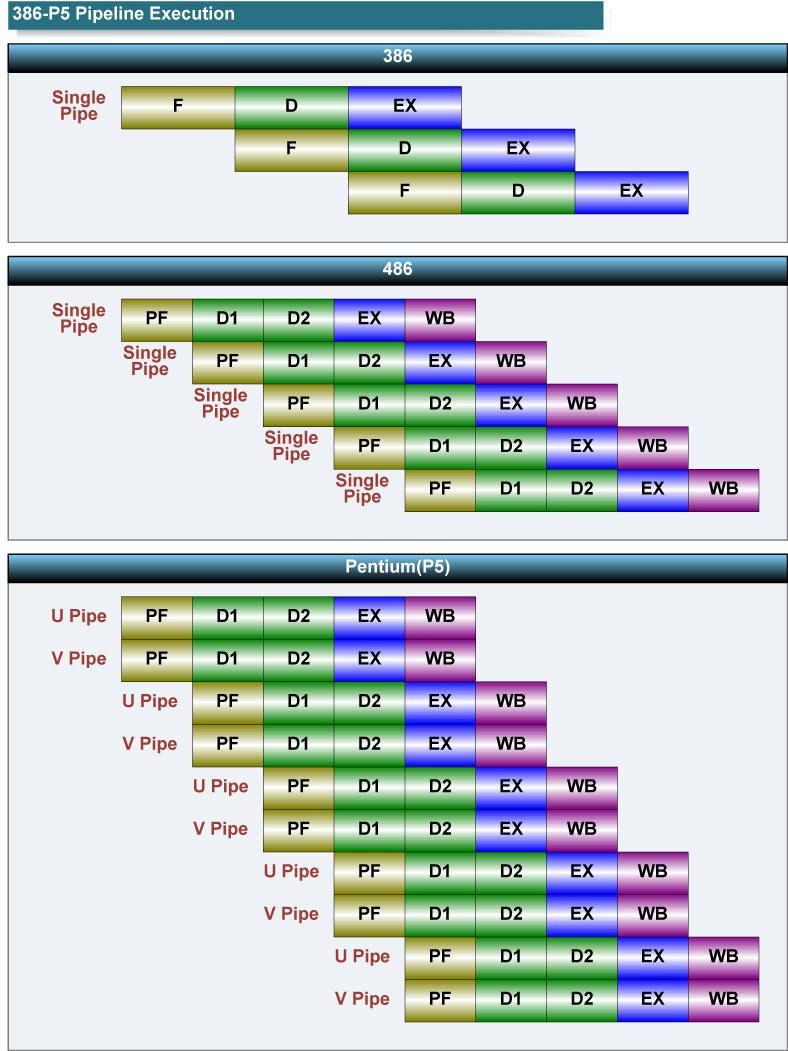 실행 파이프 라인은 "U 파이프 라인"과 "V 파이프 라인"의 2개. 첫 번째 U 파이프가 모든 명령을 실행 가능한 메인 파이프인 반면, 두 번째 V 파이프는 단순히 명령만 실행 가능한 서브 파이프다. U 파이프와 V 파이프 동기화하여 쌍이 된 명령을 순차 실행한다. 실행 유닛도 하드 와이어드 화가 진행, 처리량이 높아졌다.