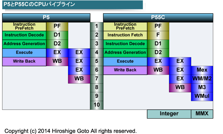 Intel은 97년에는 Pentium (P5) 아키텍처에 MMX 명령을 더한 Pentium MMX (P55C)를 추가한다. Pentium MMX (P55C)에서는 MMX 파이프를 새로 더했을 뿐만 아니라, 분기 예측의 대폭적인 강화와 캐시의 배의 용량, 명령 큐의 추가, 파이프 라인의 재검토와 파이프 라인의 6 스테이지화도 했다. 말하자면 강화판의 Pentium이다.