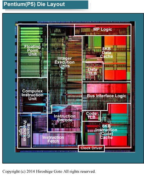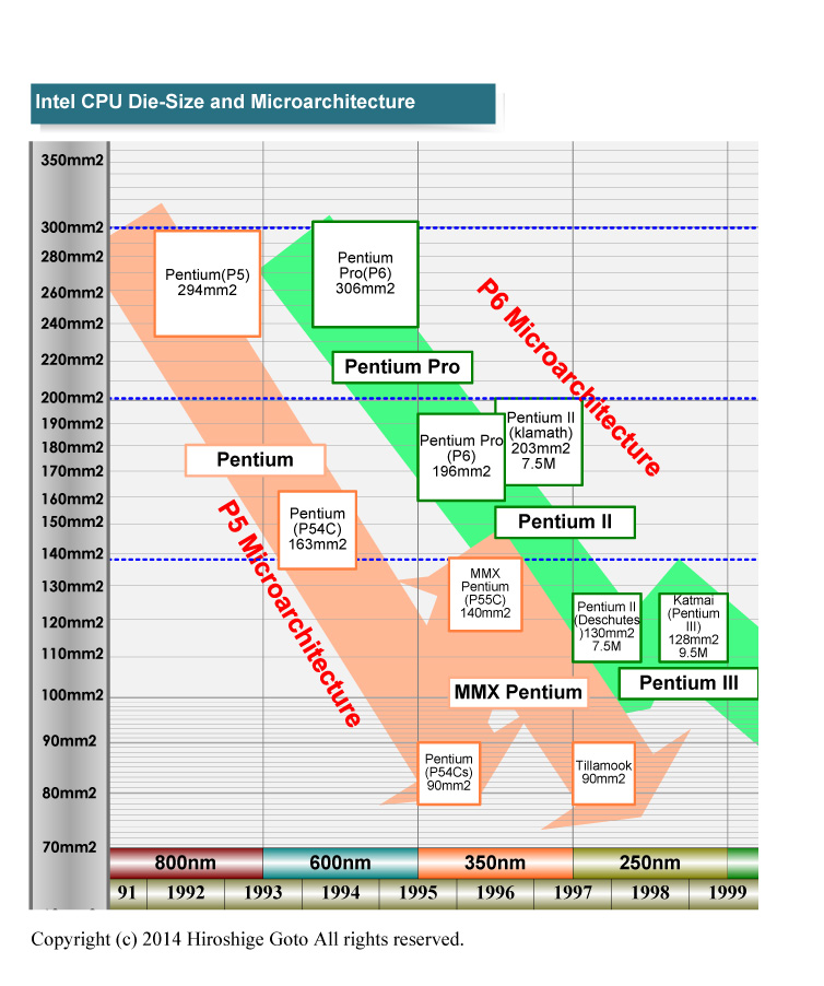 방대한 트랜지스터 수를 거두기 때문에 Pentium (P5)에서는 다이 크기도 커졌다. 초대 0.8μm 버전의 다이는 294 제곱 mm로, 당시로서는 거대 사이즈. 0.6μm의 P54C에서 163 제곱 mm로 당시의 고성능 PC용 CPU의 사이즈로, 0.35μm의 P54CS에서 메인 스트림 용 CPU인 90 제곱 mm로 축소됐다. 따라서 시장도 당초는 서버 및 워크스테이션 이었던 것이 고성능 PC, 메인 스트림 PC로 서서히 퍼져 나갔다. (예를들면 예전에는 펜티엄 CPU가 나오면 엄청나게 비싸고, 기존 486 CPU가 저렴해지면서(이쪽도 공정이전) 보급형이 되고, 더 시간이 지나면 펜티엄 CPU도 보급형까지 내려오는 패턴이 이런 이유. 지금은 그냥 처음부터 단종까지 가격이 같죠. 시장 가격이야 조금씩 다르지만.. 펜티엄의 경우 기업체나 갑부가 아닌 아주 일반 개인의 경우는 94년도 부터가 서서히 보급 되었다고 봐야겠죠. 이때도 500~600만원이 넘는 웍스테이션용 펜티엄 PC도 광고했지만, 100만원대 펜티엄 PC가 나오기 시작해, 94년 중후반 ~ 95년 초반이 펜티엄을 충분히 개인이 살 수 있을 정도가 되었다고 봐야죠. 예전 국내 뉴스를 찾아보면... 네이버 뉴스 라이브러리 용산에서 조립으로 잘 사면 이보다 좀더 싸게 샀겠죠. 물론 요즘의 100만원과 90년대 중반의 100만원은 가치가 다르기 때문에, 100만원대 펜티엄이라고 해도 개인이 살만하다는 거지, 누구나 다 펜티엄을 막 살 수 있지는 않았습니다. 컴퓨터가 꼭 필요한가 이런 문제도 있구요. 국내에서 이집저집 누구나 사고 꼭 필요하다 꼭 1대는 있어야 한다 이런 시대는 99년 ~ 2000년대 들어서죠.)