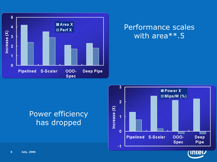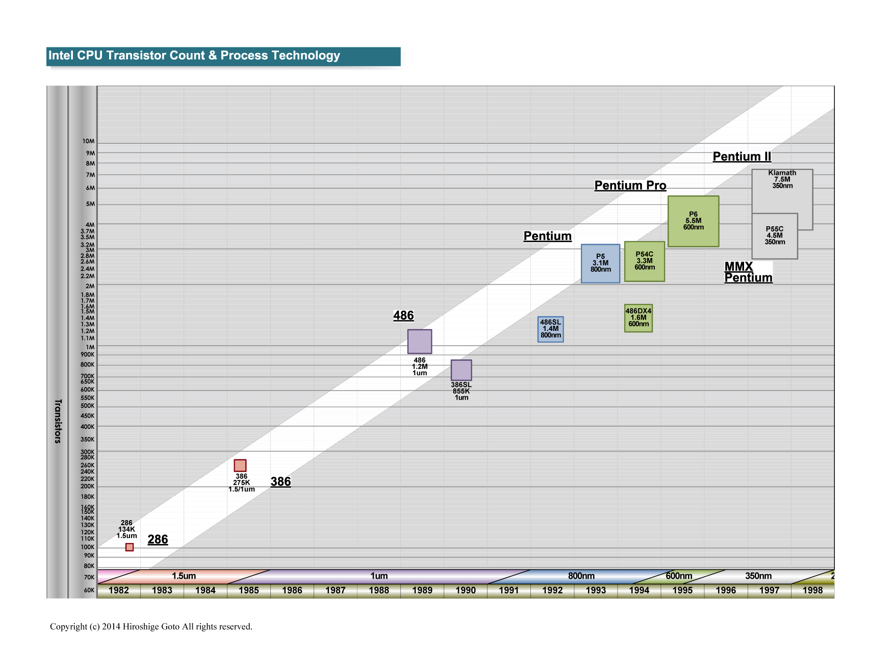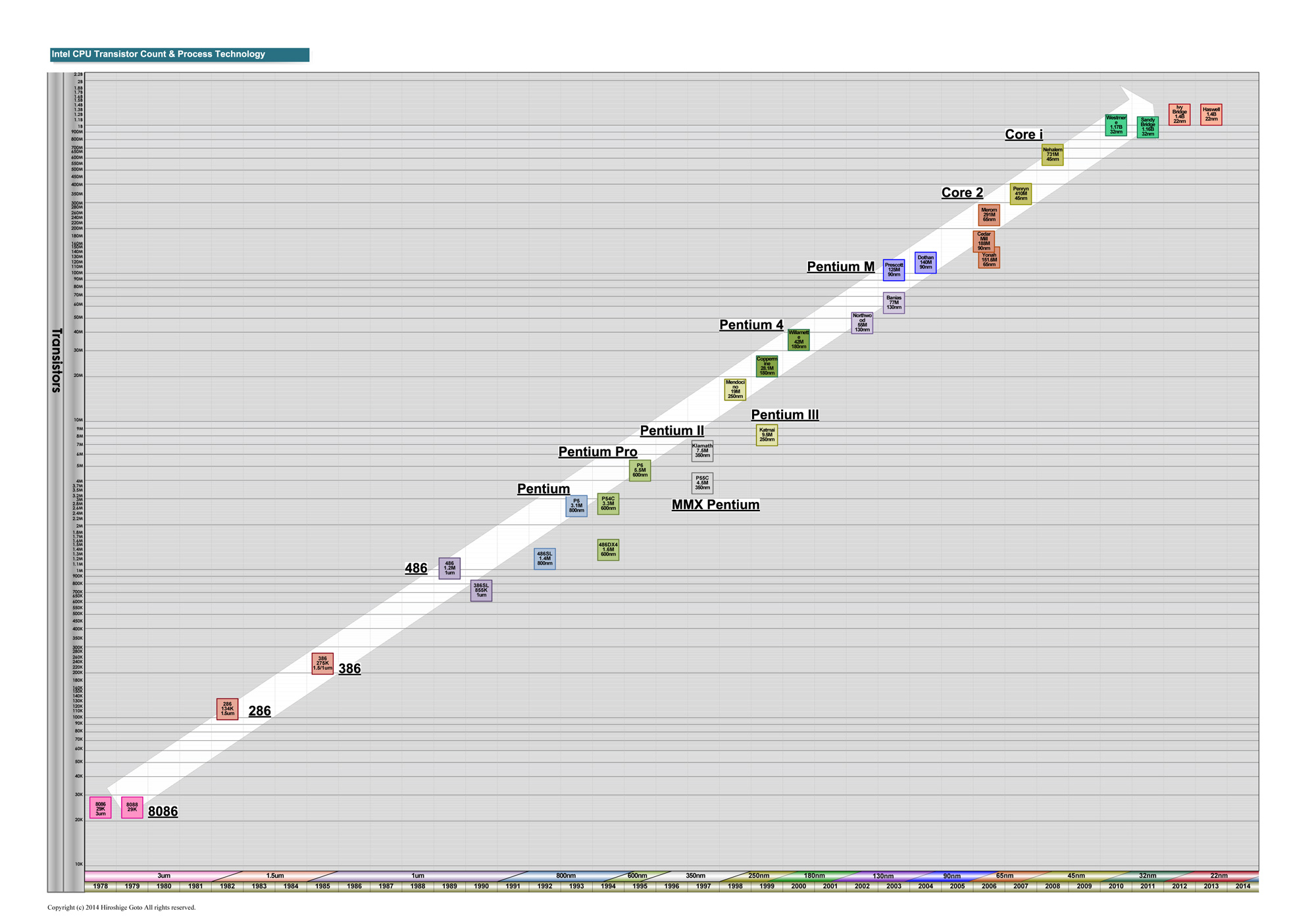 Intel CPU 전체의 트랜지스터 수의 이행을 보면, 언뜻 순조롭게 2년에서 2배 정도 트랜지스터 수가 증가해 온것 처럼 보인다. 그러나 실제로는 Intel의 로직 공정의 미세화나 다층화는, 초기에는 천천히하고, Pentium (P5)의 0.8μm (800nm) 부터 급 가속되는 것이 나타난다. 8086부터 486까지는 CPU의 다이 크기를 크게하는 것으로 트랜지스터를 늘린 측면이 있다.