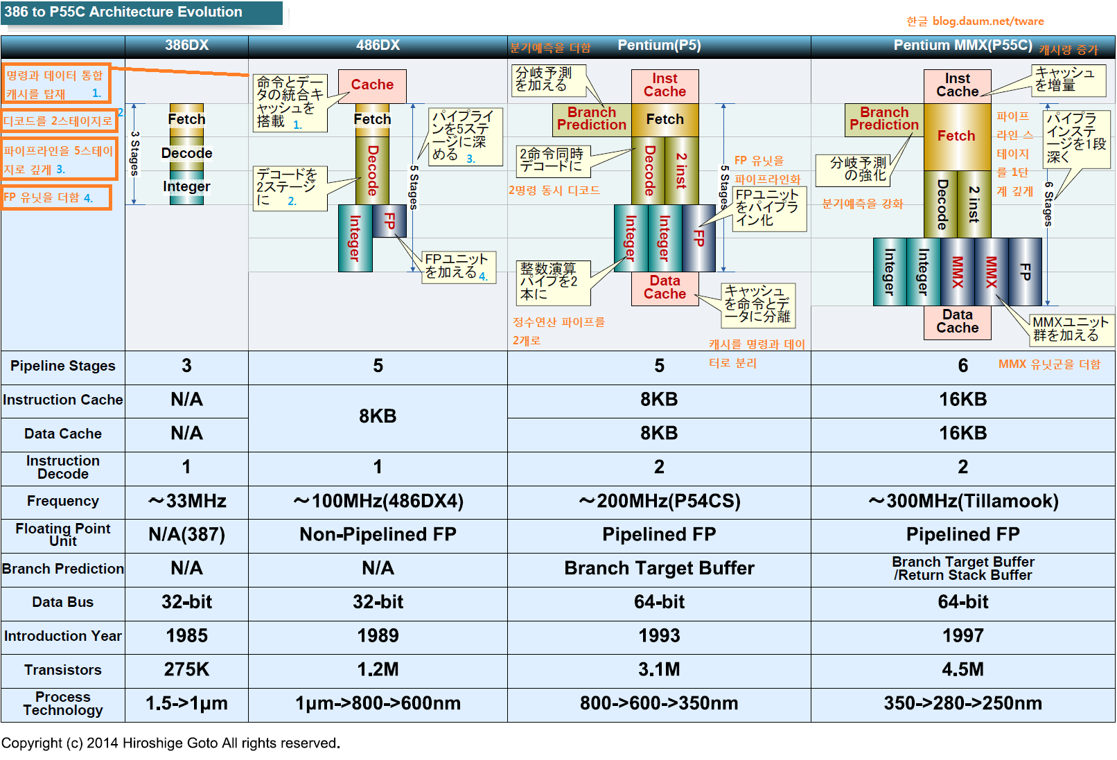 386에서 Pentium MMX (P55C)까지의 아키텍처 전환.