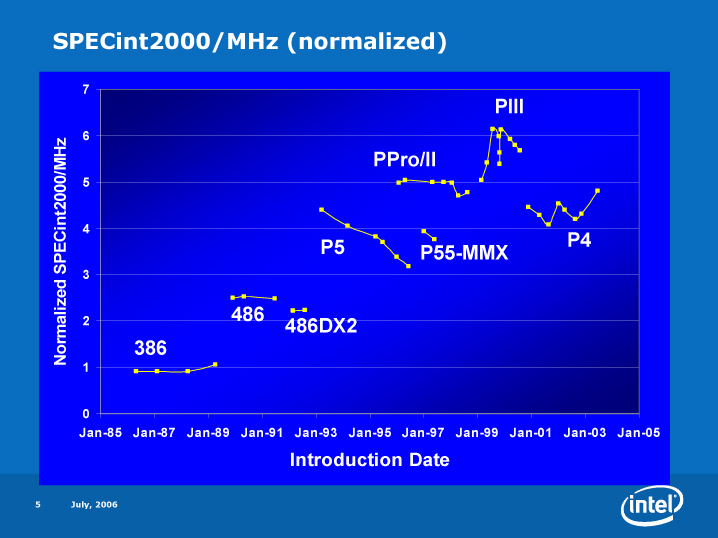 또 CPU 아키텍쳐 개발도 Pentium (P5)부터 급 가속해서, 그때까지의 4년에 1 마이크로 아키텍처의 속도에서, 2년에 1 마이크로 아키텍처의 도입으로 바뀌었다. 즉, Pentium (P5)을 계기로 Intel의 논리 공정과 CPU 마이크로 아키텍처 개발은 배속화 되었다.